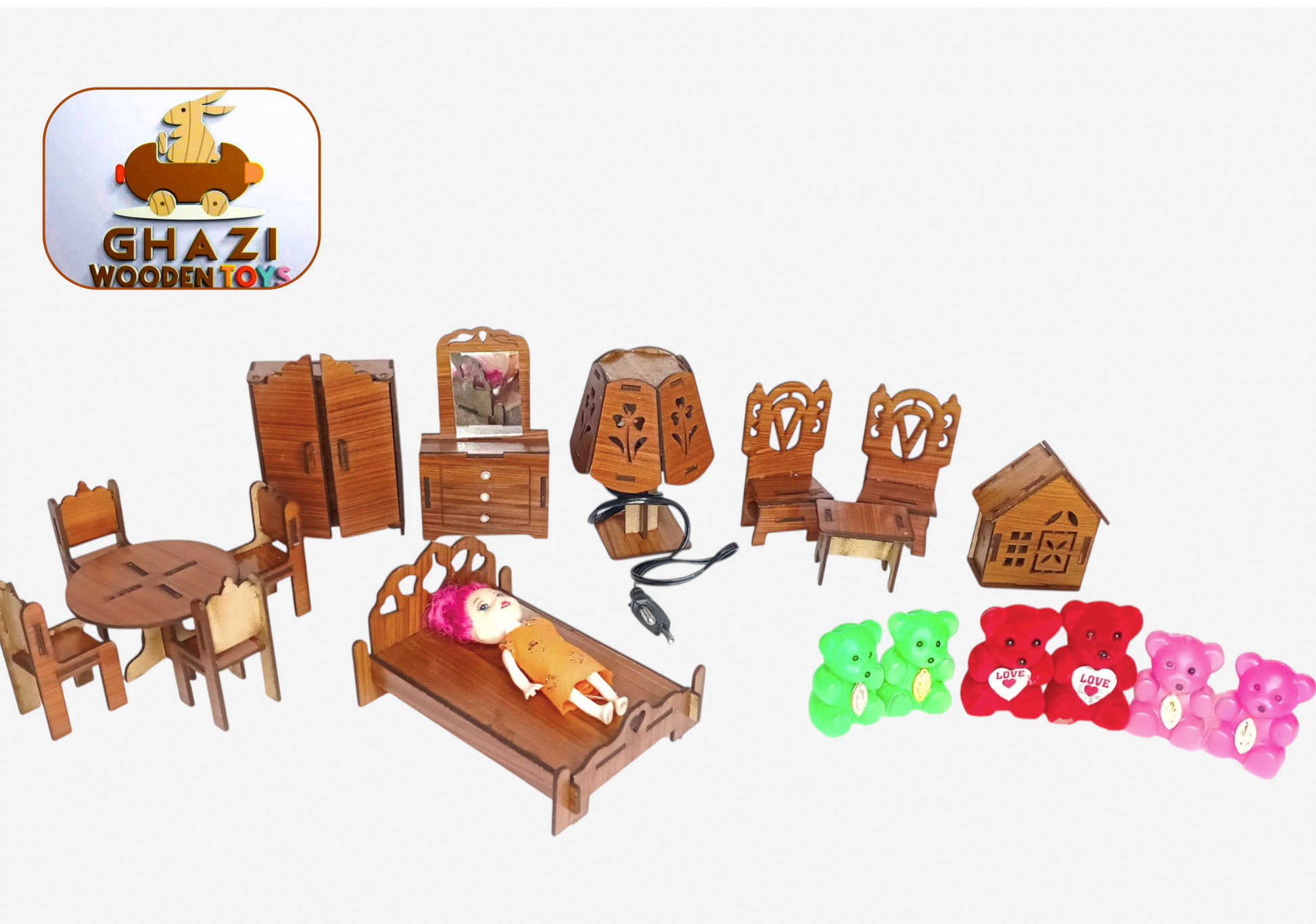 🛏️ Wooden Bed | 🚪 Wardrobe | 🪞 Dressing Table with Mirror | 🍽️ Table & Chairs | 🪑 Swing Chairs | 💡 Wooden Lamp | 👧 Doll | 🧸 Teddy Bears | 🏠 Wooden House